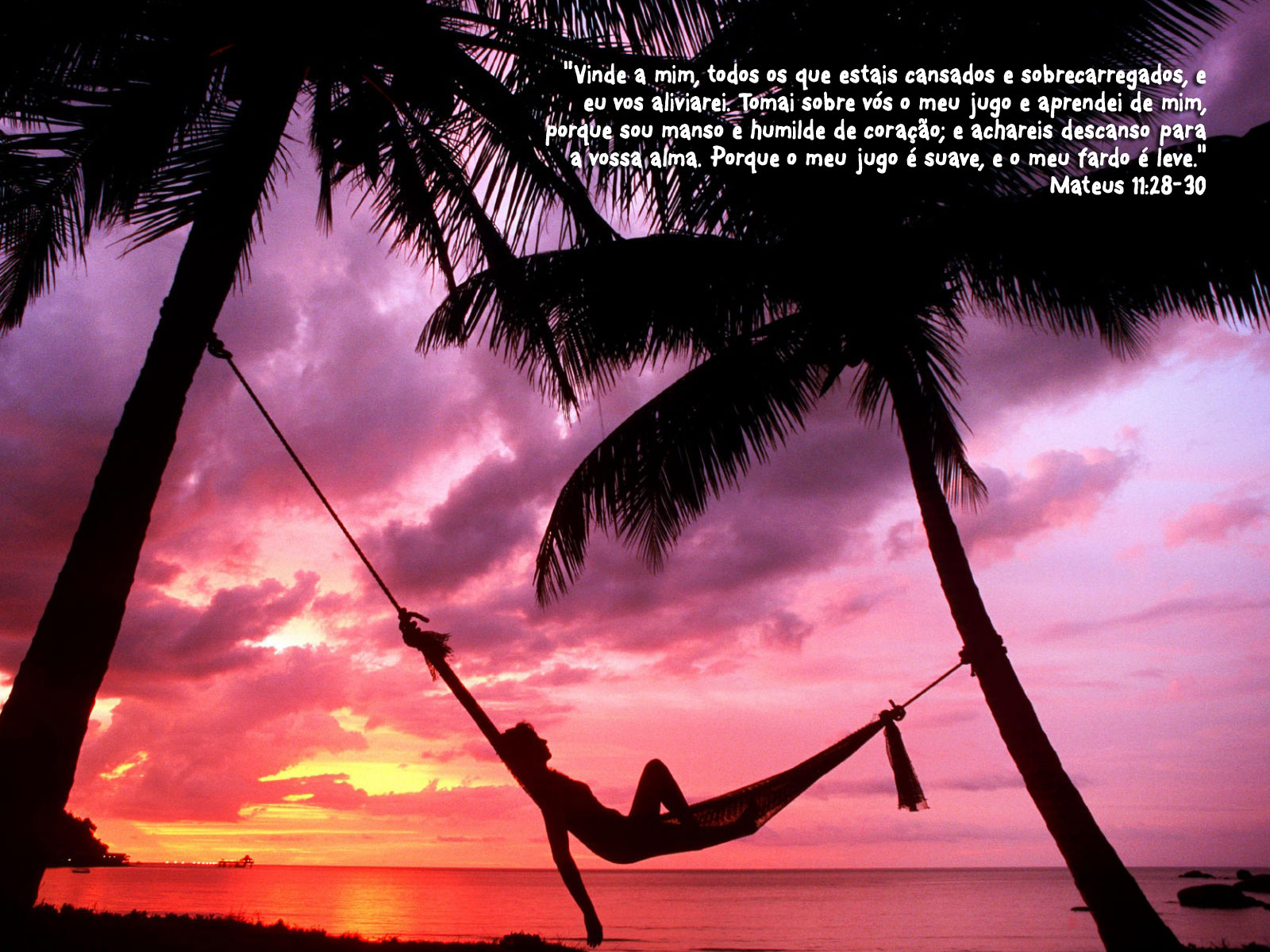 "Vinde a mim, todos os que estais cansados e sobrecarregados, e eu vos aliviarei. Tomai sobre vós o meu jugo e aprendei de mim, porque sou manso e humilde de coração; e achareis descanso para a vossa alma. Porque o meu jugo é suave, e o meu fardo é leve." Mateus 11:28-30