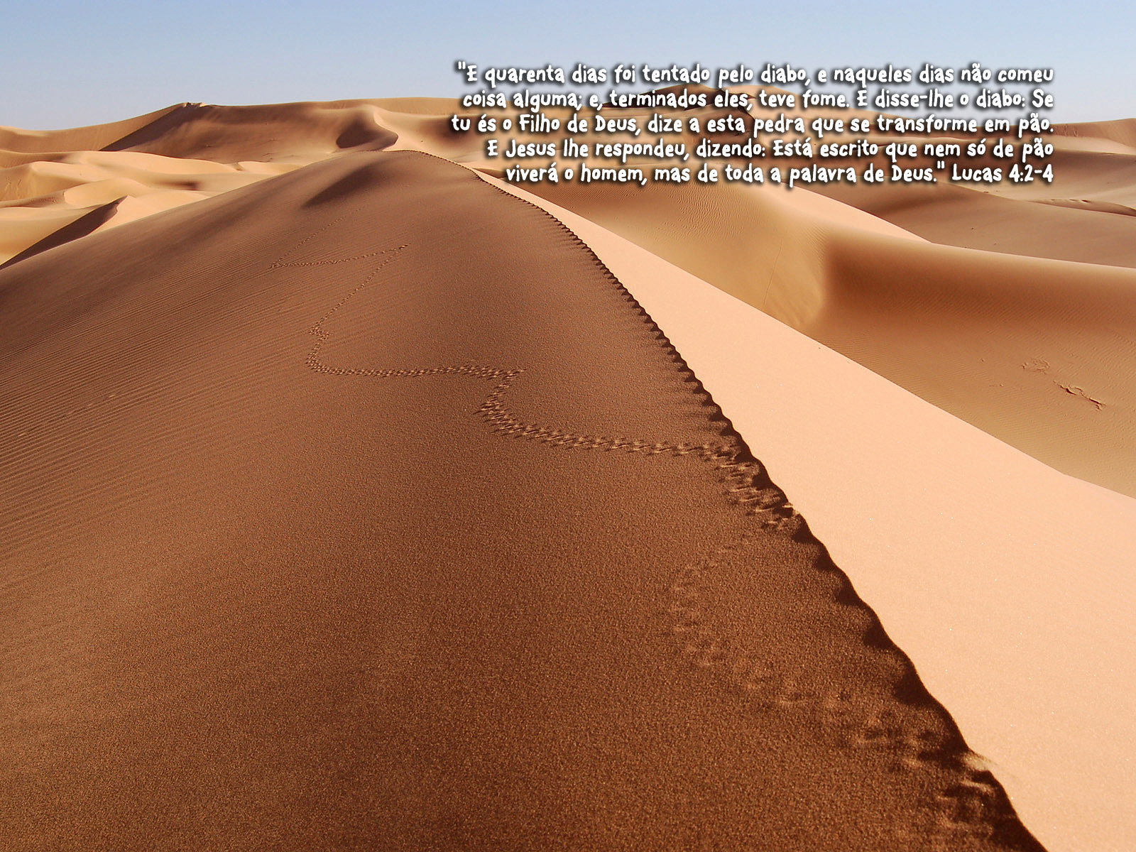 Pensamento: Jesus esteve 40 dias no deserto, e o tempo todo foi tentado pelo diabo, mas somente quando teve fome, o diabo deu a sua maior investida. O inimigo é assim, ele espera a hora certa para atacar, geralmente no momento de maior fraqueza da nossa carne. Sua estratégia é basicamente desafiar nossa capacidade, nos incentivando a usar os recursos que temos disponíveis no momento para uma solução imediata dos problemas... No entanto, sua intenção é desviar nosso olhar das conseqüências, seu objetivo é nos conduzir ao erro mostrando um caminho aparentemente mais curto, mais que no final nos desviará do propósito do Senhor.